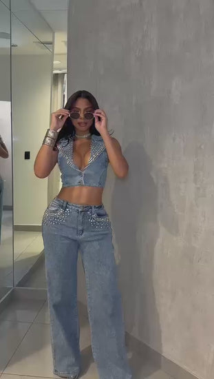 Conjunto denim de dos piezas que redefine el estillo casual con un toque glam.el chaleco crop con un toque estructurado realza el escote con elegancia y destaca por sus delicados apliques brillantes, aportando luz y sofisticacion al look. El pantalon de tiro medio y silueta amplia estiliza la figura brindando movimiento y comodidad sin perder el estilo